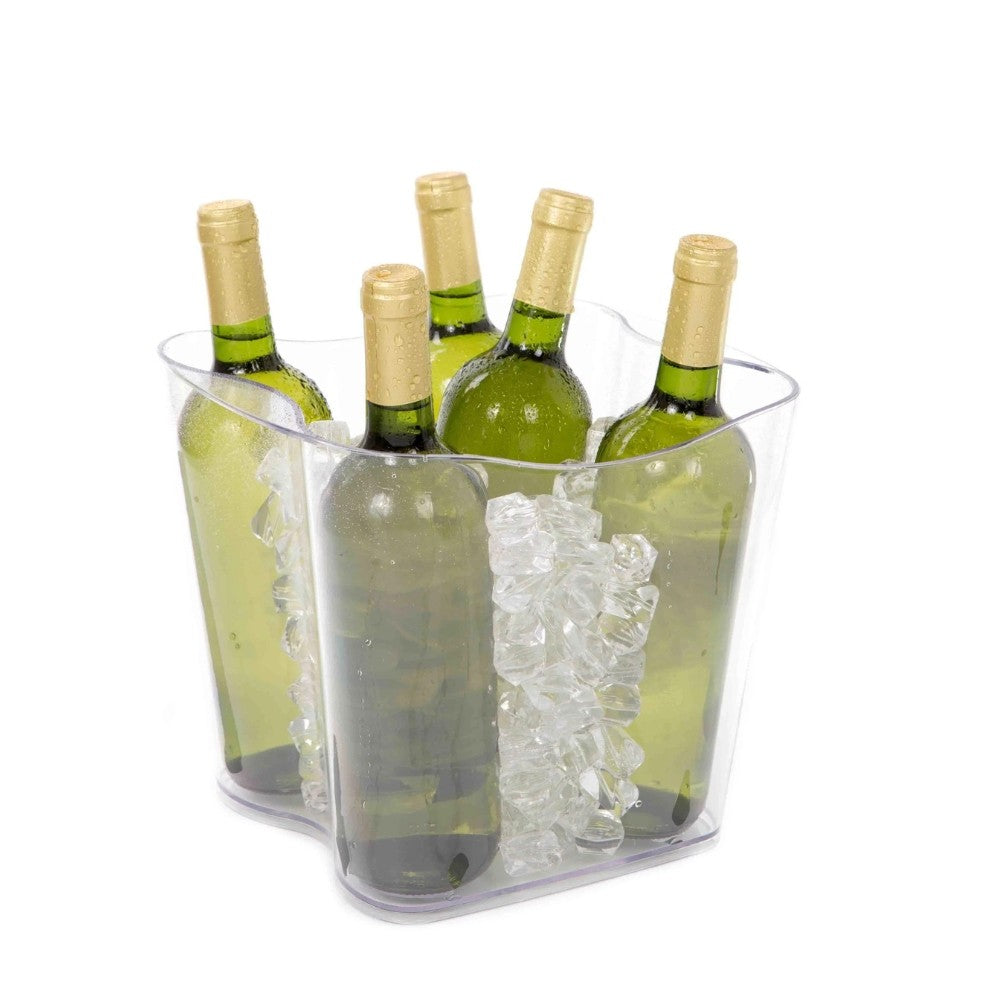 Jäiden lisäksi tähän cooleriin mahtuu 4-5 viinipulloa. Läpinäkyvä cooler sopii kattaukseen aina ja juomat pysyvät sopivassa tarjoilulämpötilassakin. Coolerin voi hyvin täyttää myös limsapulloilla ja tölkeillä.