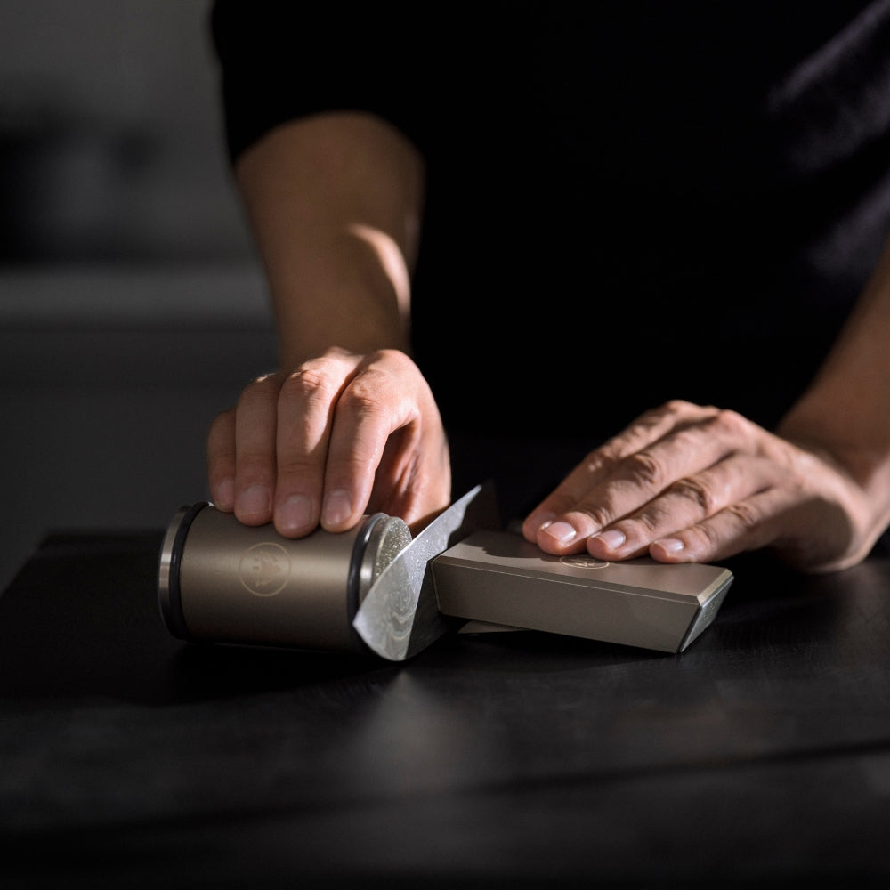 - Aseta tämän jälkeen rulla vaakatasoon pöydälle veitsen terää vasten ja rullaa timanttista hiomalevyä hitaasti veitsen reunaa pitkin. Viimeistele teräslevyllä.