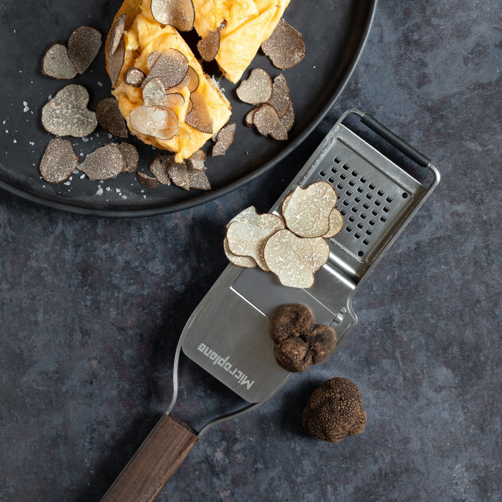 Microplane Master -tryffelihöylä sisältää kaksi erilaista terää. Erinomainen työväline tryffelin, sienten, parmesaanin ja monien muiden herkkujen valmisteluun. Samalla työvälineellä voi höylätä ja raastaa.