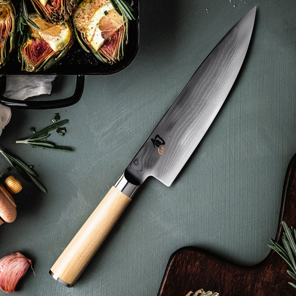 Perinteinen teräväkärkinen kokkiveitsi japanilaiselta huippubrändiltä. KAI Shun Classic -kokkiveitsi vaalealla kahvalla on erinomainen veitsi monien raaka-aineiden käsittelyyn.