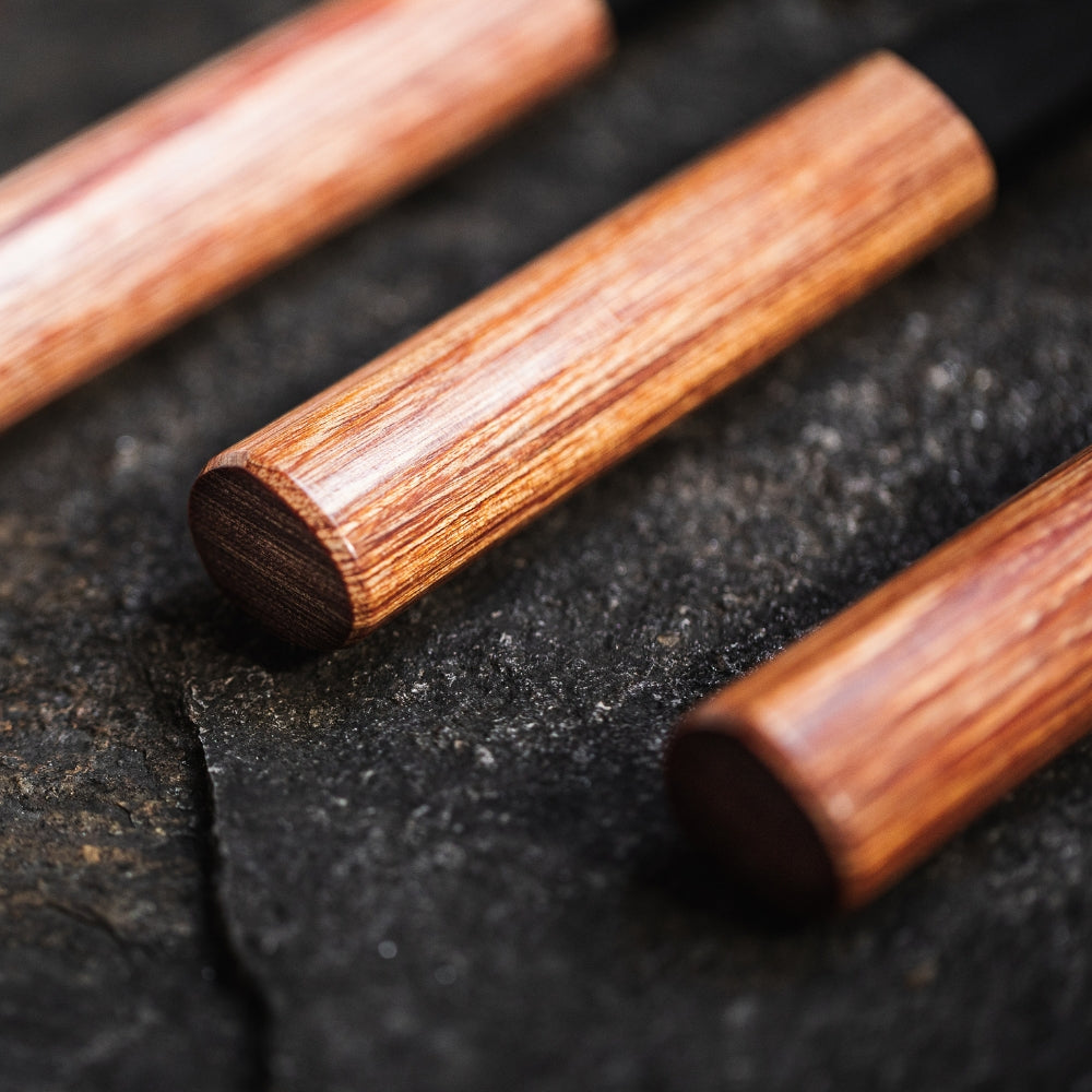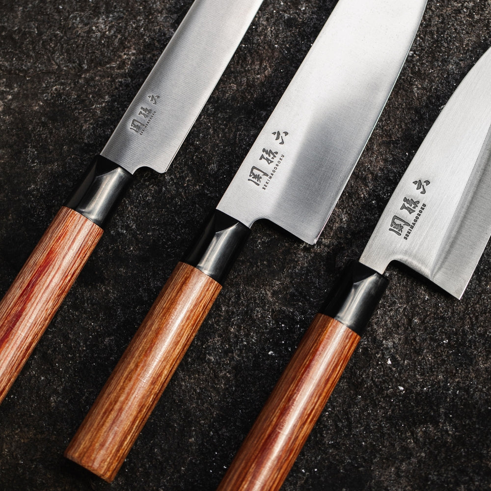 Tämä sarja edustaa japanilaisen veitsentekoperinteen ydintä yksinkertaisuudessaan ja ajattomuudessaan. Veitset valmistetaan korkealaatuisesta ruostumattomasta teräksestä tarjoten hyvän terävyyden, kestävyyden ja helpon huollettavuuden päivittäiseen käyttöön. Pakkapuusta valmistettu punaruskea kahva tuo veitsiin tyylikkään perinteisen ilmeen. Veitsi on erinomaisessa tasapainossa ja mukava pitää kädessä. Erinomainen veitsisarja kotikeittiöön, jossa arvostetaan toimivuutta, kestävyyttä ja japanilaista laatua ilman turhaa ylellisyyttä.