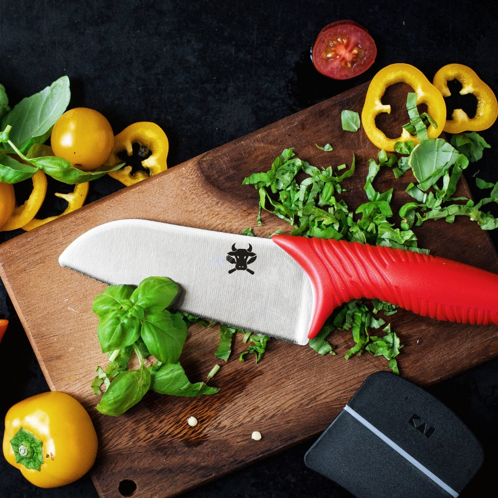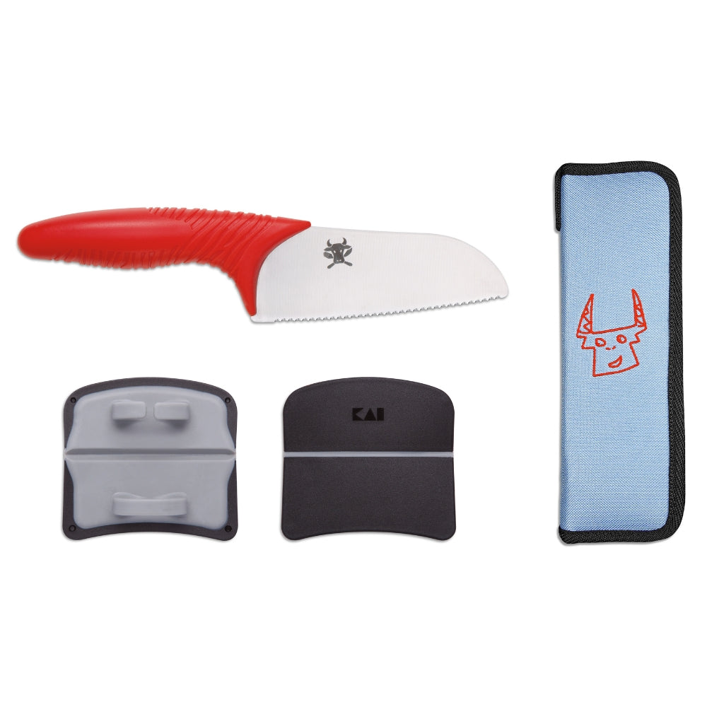 Tim Mälzerin ja KAI:n yhdessä suunnittelema Junior‑kokinveitsi auttaa lapsia oppimaan veitsenkäyttöä turvallisesti. Hieno sahalaita tekee leikkaamisesta kevyttä ja vähentää lipsumisen riskiä, ja pyöristetty kärki lisää turvallisuutta. Luistamaton ergonominen kahva sopii täydellisesti pienille käsille. Mukana joustava sormisuoja ja kätevä veitsipussi.