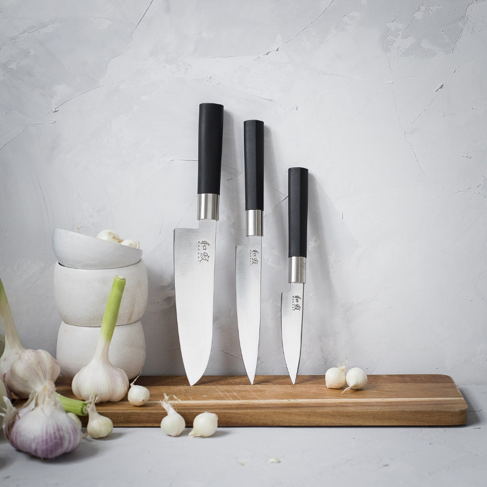 Tämä tyylikäs veitsisarja on suunniteltu tehokkaaseen ja huolettomaan päivittäiseen käyttöön. Ruostumattomasta teräksestä valmistettu terä tarjoaa hyvän terävyyden ja kestävyyden. Ergonominen mattamusta kahva on kosteudenkestävä, hygieeninen ja takaa hyvän otteen. Wasabi Black -veitsi on luotettava valinta kotikeittiöön ja ammattikäyttöön, kun veitseltä halutaan toimivuutta, helppohoitoisuutta ja japanilaista laatua. Loistava hinta-laatusuhde!