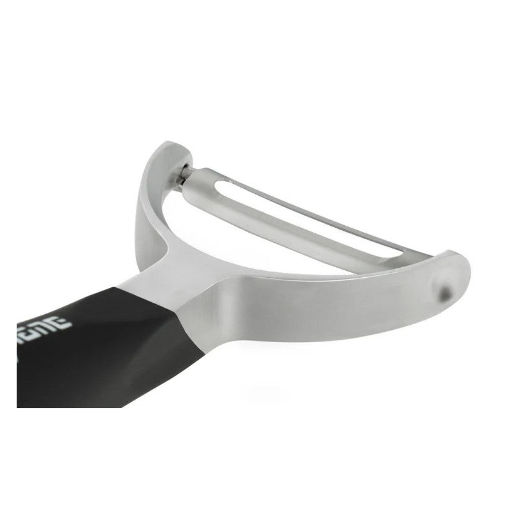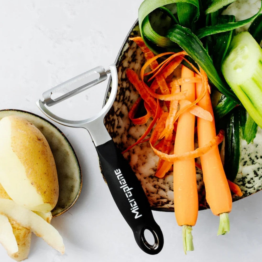 Microplanen Professional Y Peeler Microplanelta on oikea väline, kun haluat kuoria ohuita siivuja. Erittäin terävä tuplaterä ruostumattomasta teräksestä. Soveltuu parsan, porkkanan, kurkun, kesäkurpitsan, lantun, mangon, omenan ja tietysti perunan kuorimiseen.