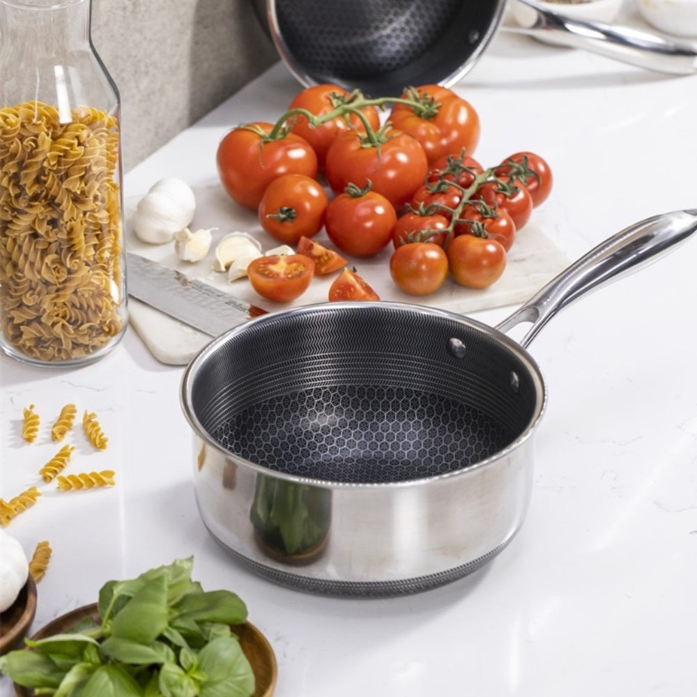 HexClad Hybrid -kattila on täydellinen valinta kastikkeiden valmistukseen, nesteiden kuumentamiseen, ruoan valmistukseen tai ruokien uudelleenlämmittämiseen. Kompaktista koostaan huolimatta se on monikäyttöinen apuri, joka ansaitsee paikkansa jokaisen kokin keittiössä.