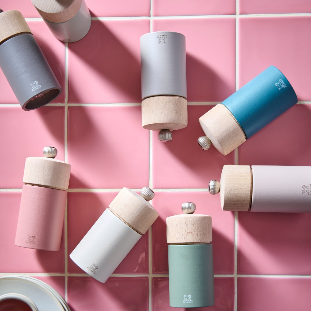 Tyylikkään sarjan myllyt tuovat keittiöön kauniit värit yhdistettynä luonnolliseen puuhun. Pippurimyllyn pinta on puuta ja sisältä löytyy laadukas Peugeot-myllyjen teräskoneisto. Myllyn nupista voi säätää pippurin haluttuun karkeuteen.