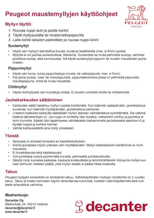 Peugeot-myllyjen teräskoneiston osilla on elinikäinen takuu. Poikkeuksena u'Select-mekanismilla on 5 vuoden takuu ja sähkömyllyillä on 2 vuoden takuu. Takuu ei kata väärästä käytöstä, putoamisesta, säilytyksestä tai väärän tuotteen käyttämisestä myllyssä aiheutunutta haittaa eikä ulkonäkövaurioita.