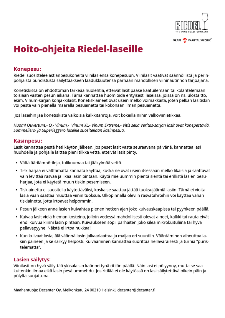 - Jos peset lasit käsin, käytä riittävän kuumaa vettä. Lasit kannattaa huuhdella heti käytön jälkeen ja kuivata kirkkaiksi Riedel-mikrokuituliinalla. Emme suosittele käsinpesuun tiskiharjaa.