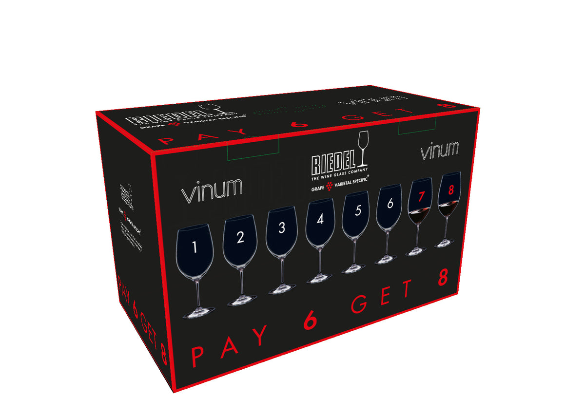 Tähän tarjouspakkaukseen kuuluu kahdeksan Riedel Vinum Cabernet / Merlot -lasia.