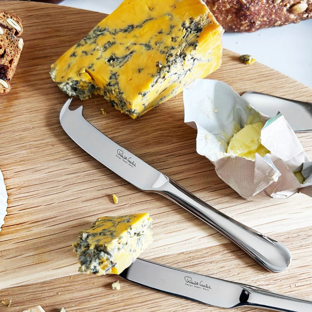 Tyylikkäät Robert Welch Radford -juustoveitset viimeistelevät juustokattauksen. Veitsen kärjessä on piikit, joilla herkullinen juustopala on kätevä nostaa omalle lautaselle.