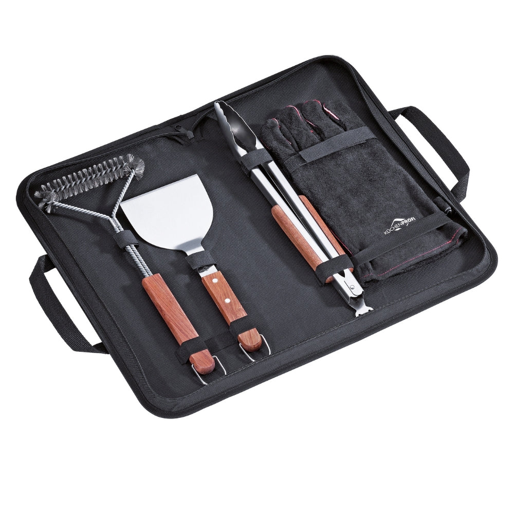 4-osainen setti sisältää kaiken tarvittavan välineistön grillaukseen. Salkussa kaikki välineet pysyvät myös siististi tallessa. Huippulaadukas setti grillauksen harrastajille!