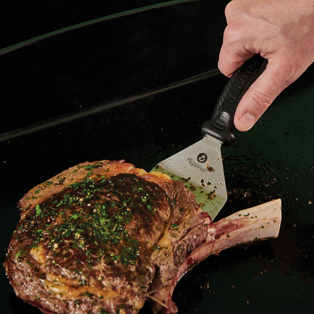 Lasta on tarpeeksi vahva, jotta sillä pystyy kääntelemään vihannesten lisäksi myös pihvit. Ergonomisesta kahvasta saa hyvän otteen. Saatavilla kahdessa eri koossa.