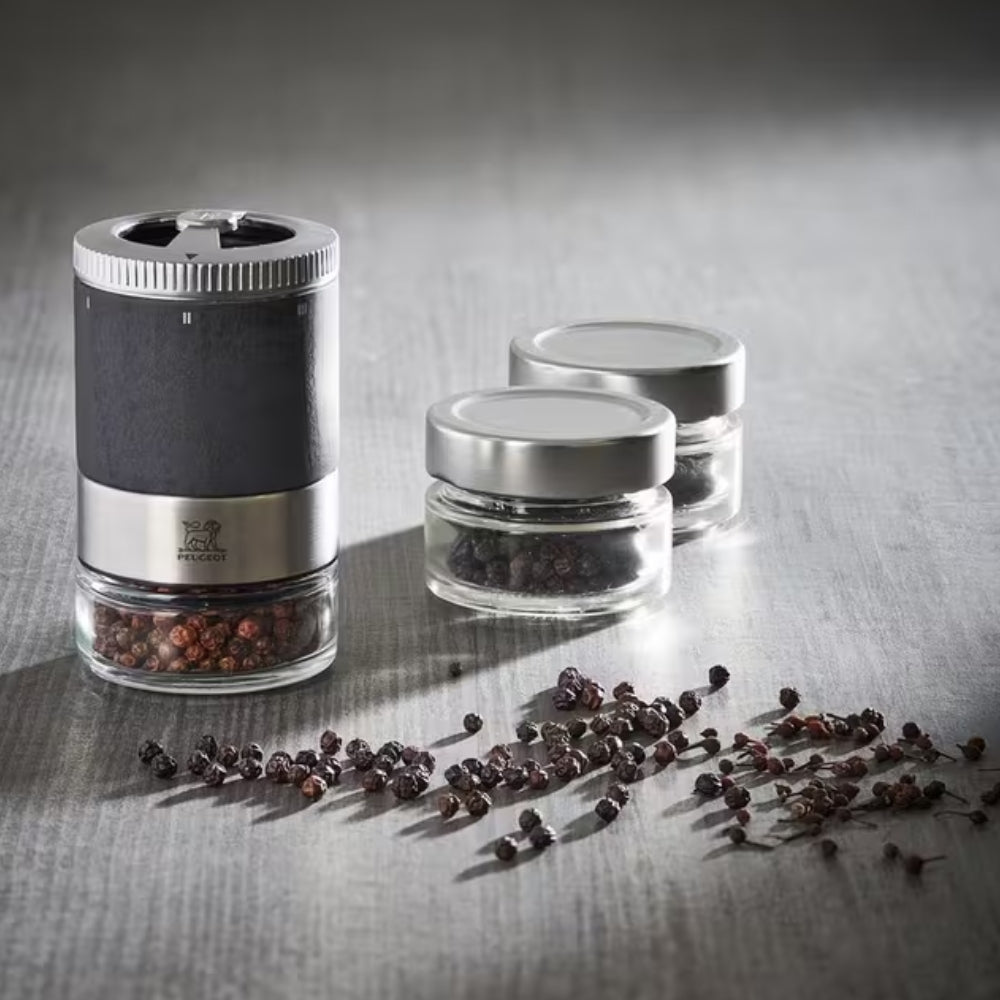 Peugeot Duo Maestro - myllysetti sisältää pippurimyllyn ja kuusi myllyn pohjaan kierrettävää lasipurkkia. Pakkauksessa on lisäksi kolme pussia erilaisia pippureita ja kolme herkullista suolapussia. Erinomainen lahjaidea kulinaristille tai omaan käyttöön!