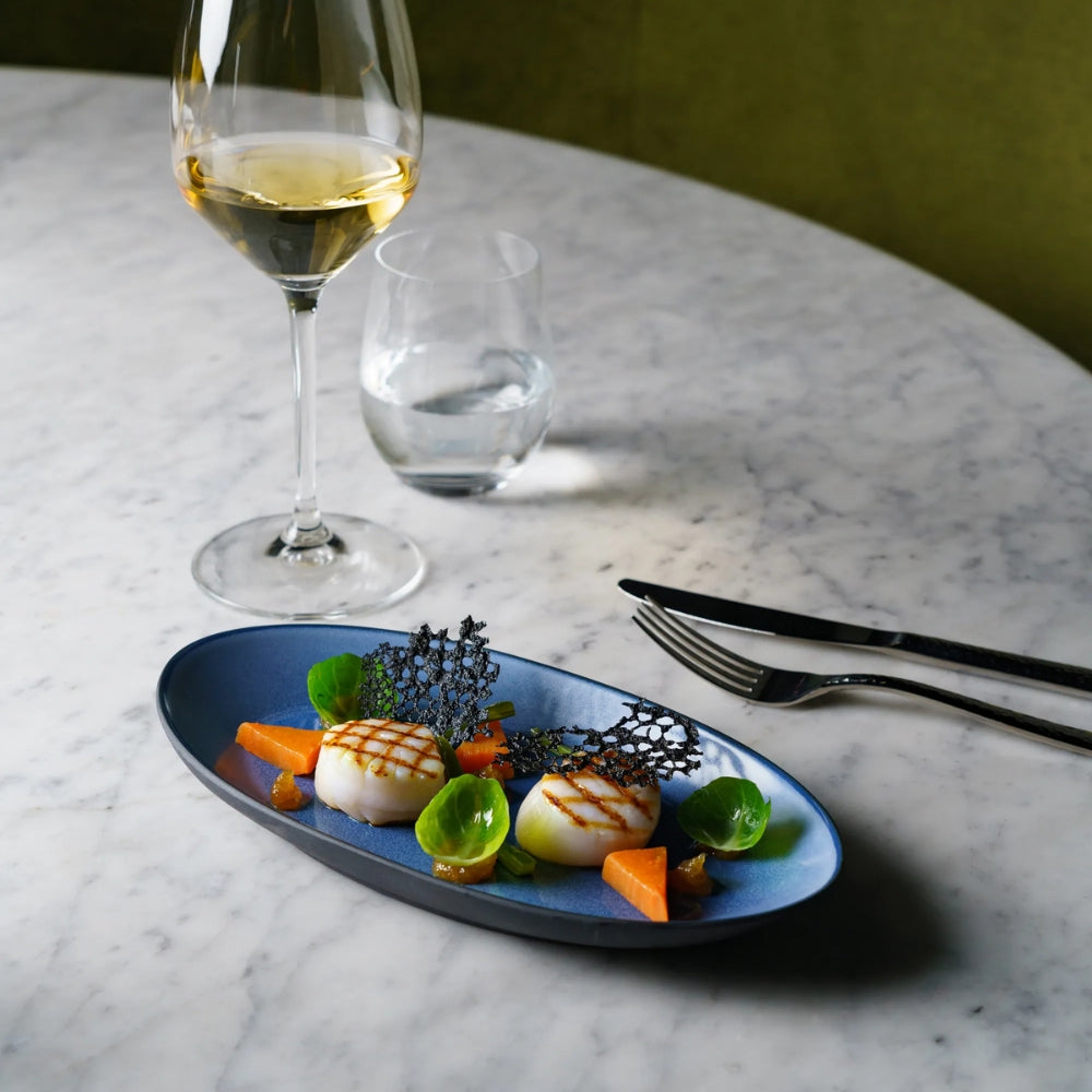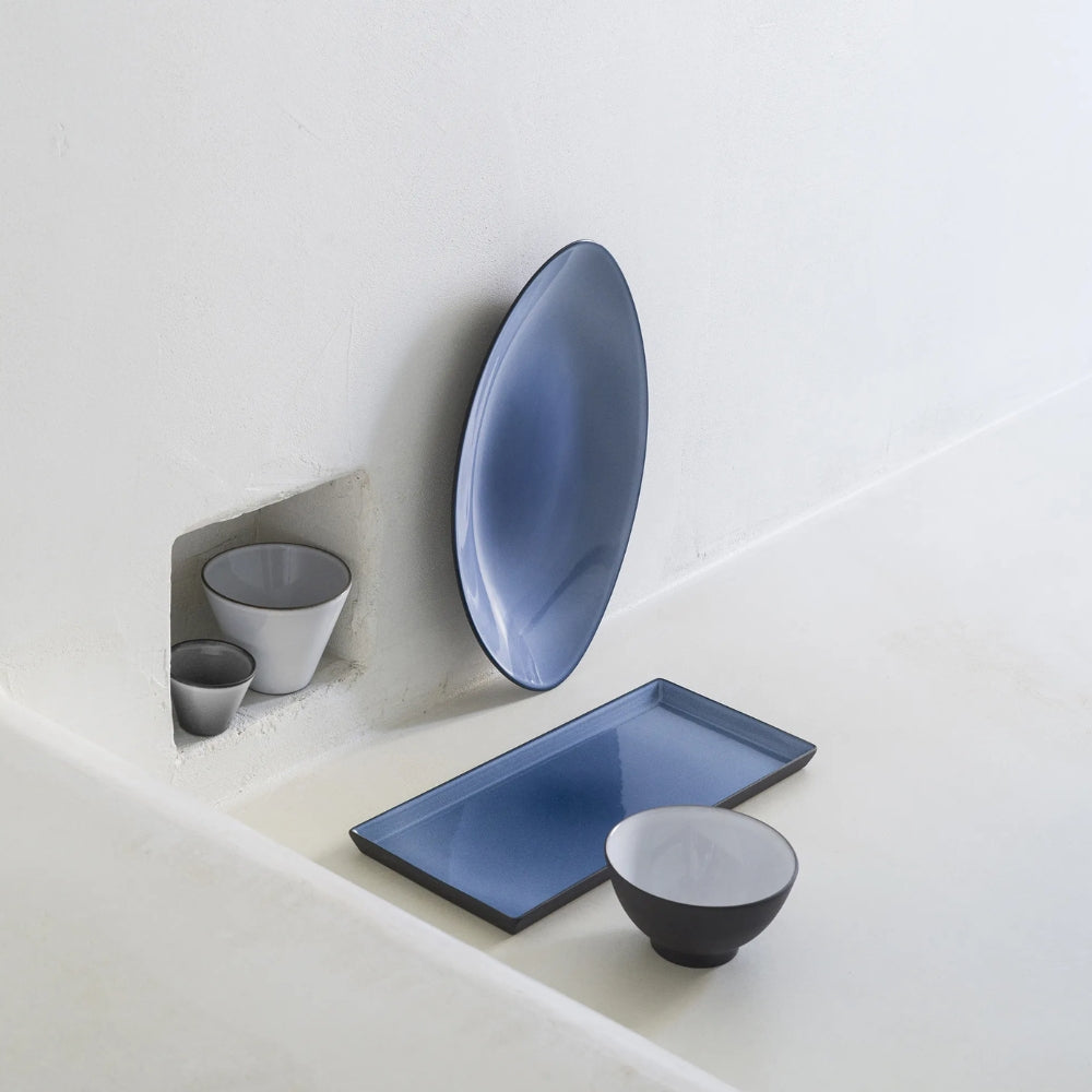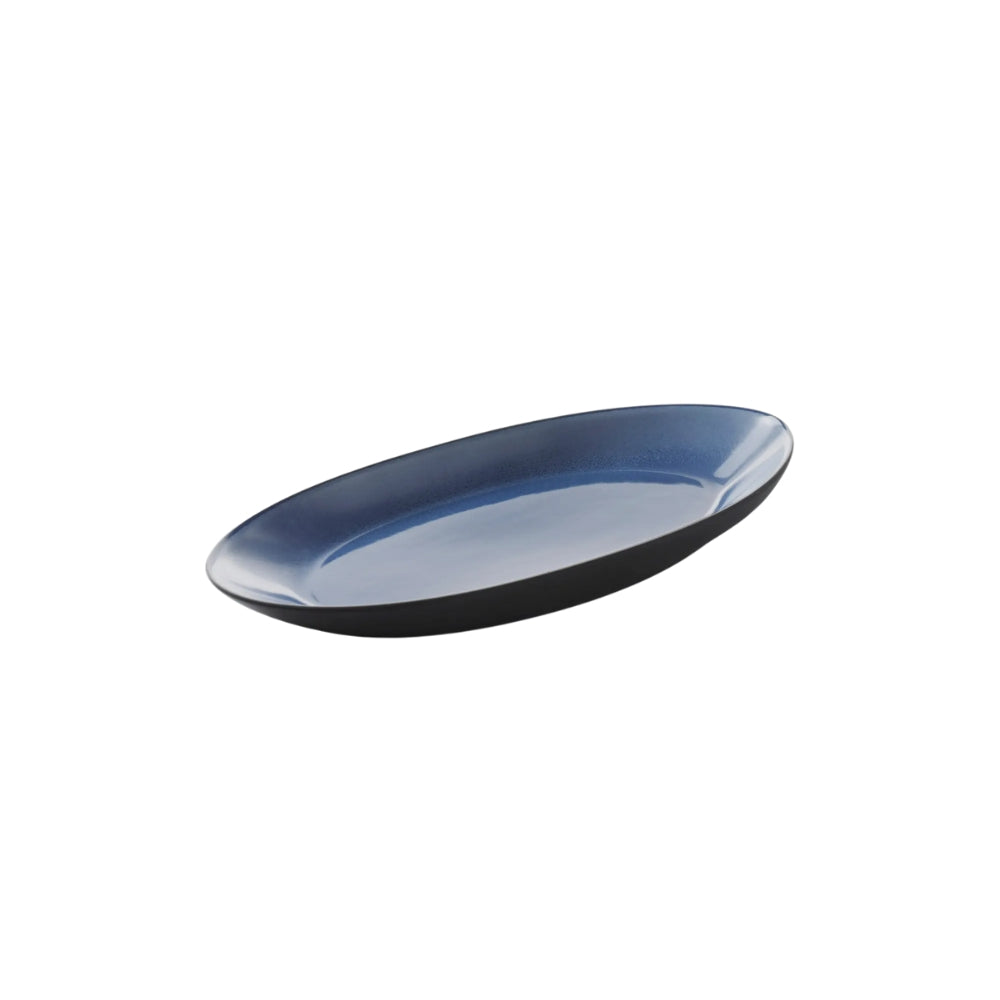Kestävä keraaminen lautanen on kauniin sininen ja ovaalin muotoinen. Kaunis sinisen sävy tuo kattaukseen persoonallisuutta. Lautasen pohja on jätetty värjäämättä, jolloin näyttävä musta savi pääsee näkymään ja on hieno yksityiskohta.