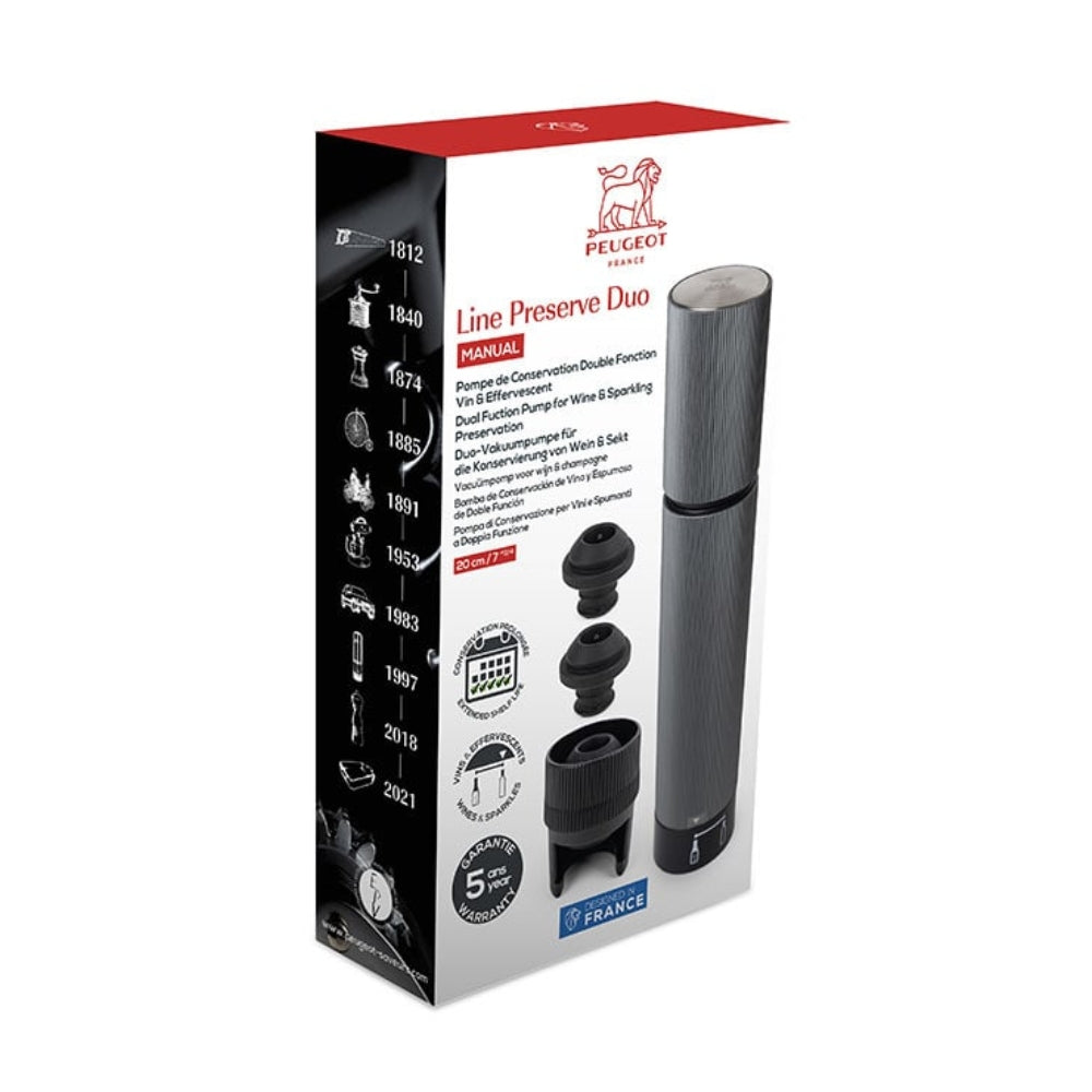 Manuaalinen Line Peugeot Preserve Duo -viinipumppu tyhjentää avatusta viini- tai kuohuviini-/samppanjapullosta ilman, jolloin säilyvyys paranee. Saat avatuille pulloille lisäaikaa, viinipulloille jopa viikon ja kuplivillekin monta päivää.